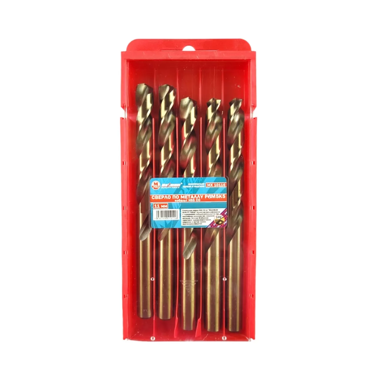 Сверла по металлу P6M5K5 HSS с добавлением кобальта обладают высокой теплостойкостью, что определяет высокий ресурс режущих кромок сверла. Общая длина: 140 мм. Рабочая часть 95 мм. Набор кобальтовых сверл из 5 шт. применяется для сверления нержавейки, титана, легированных сталей, чугуна, дерева. Широко применяется производственными предприятиями, которые работают с жаропрочными марками стали. Добавление кобальта придает дополнительную жаропрочность – выдерживает температуру до 620-630°С. Обеспечивает быстрое и точное сверление отверстий. С данной оснасткой можно работать на повышенных скоростях резания – до 20 м/с.